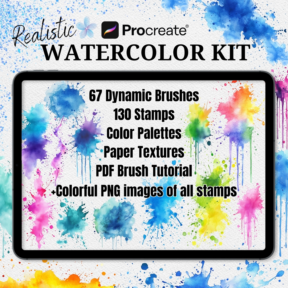 Procreate Watercolor Kit - Realistic Watercolor Brushes, Stamps, Color Palettes, Paper Texture & Colorful PNG images